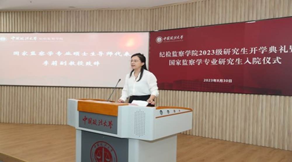 李莉副教授作为国家监察学专业硕士生导师致辞。她表示导师是新老生间的纽带,基于自身指导学生的工作经验,指出学术训练是真正开启研究生生活的关键,并将训练内容精炼的归结为“三心二意”。“三心”即好奇心,敬畏心和自信心,“二意”即研究意识和交流意识,同时祝同学们学业有成。