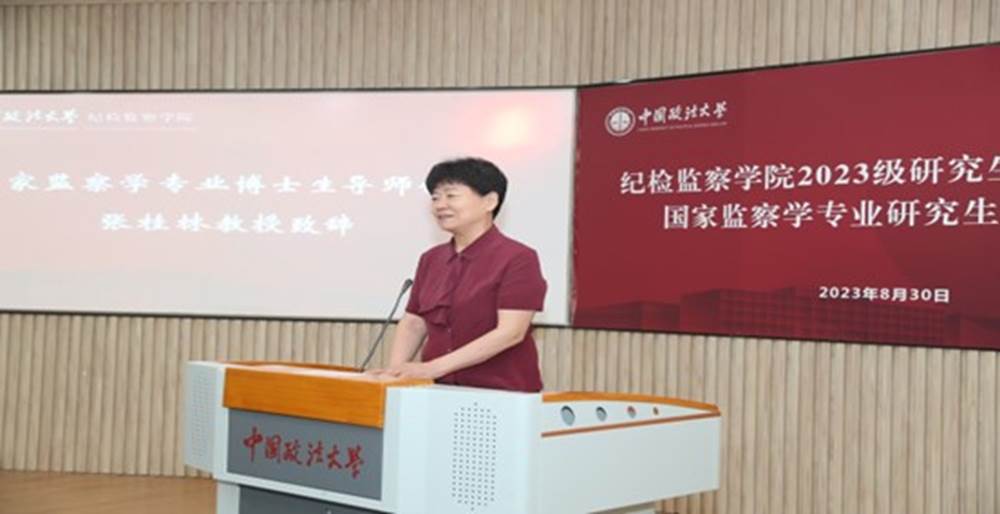 张桂林教授作为国家监察学专业博士生导师代表致辞。她对新学院的成立、新学科的设立、新同学的到来表示衷心的祝贺,对学生们未来的学习和发展寄予厚望。她认为纪检监察兼具独立性与多元性的学科,既有独立的研究属性和研究对象,又以多元化的学科知识为背景;是实践性与理论性高度融合的学科;是政治性与学理性高度融合的学科,学术研究要具有正确的政治立场和宽阔的思想视野。