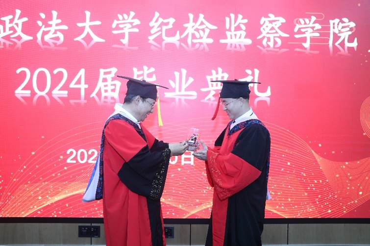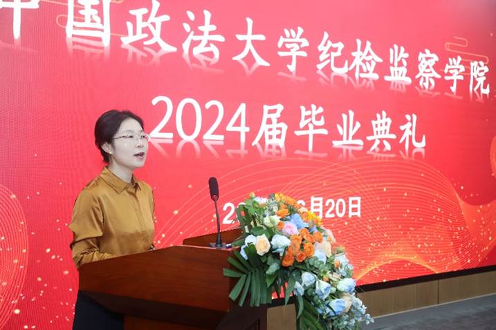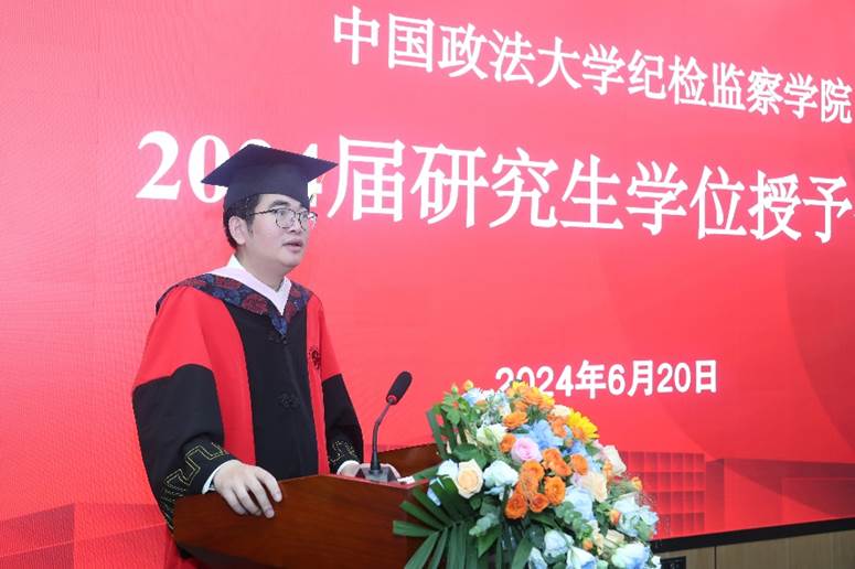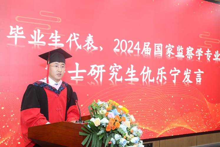 随后,2024届国家监察学专业博士仇乐宁作为毕业生代表发言。他深情回顾了在学院度过的三年时光,感谢学院和导师们的悉心培养和教导。他表示,无论未来走向何方,都将牢记法大人的身份和追求人生理想的初心。