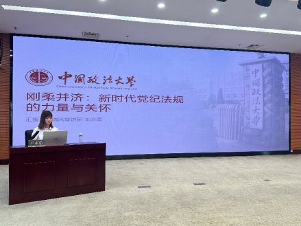 接着,王亦湑作题为《刚柔并济:新时代党纪法规的力量与关怀》的主题宣讲。王亦湑以新时代党纪法规的力量和关怀为切入点,分别阐述党纪法规的“刚”之力与“柔”之怀。她的宣讲内容分为三部分:第一部分,她在全面从严治党的背景下,结合大量的官方数据与公开案例详细阐述了党内法规制度在演变历程中的不变刚性力量;第二部分,她从思想教育、行为规范、惩处力度三方面的变化阐述新时代党纪法规的柔性关怀;第三部分,她就刚性措施的成效、柔性措施的成效与综合成效三方面进行总结发言,指出党纪的刚柔并用不仅是一种策略和方法,更是一种理念和精神的体现。