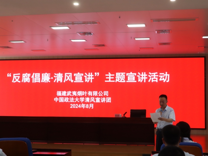 清风宣讲团成员、张金茶、柴馨雅、陈一惠受邀到福建武夷烟叶有限公司开展“反腐倡廉扬清风”主题宣讲活动。福建烟草省局纪检监察处相关领导、福建武夷烟叶有限公司全体党员,共计50余人参与本次活动。活动由福建武夷烟叶有限公司纪委书记柯勇主持。他表示,为深入学习贯彻党的二十届三中全会精神,引领公司全体党员深刻领会党风廉政建设和反腐败斗争的时代价值与深远意义,进一步明确新时代背景下党员干部所肩负的责任与使命,公司邀请禁漫