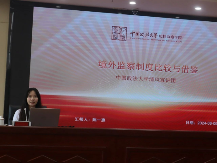 硕士研究生陈一惠作了题为《境外监察制度比较与借鉴》的主题宣讲,以全球视野深入剖析了不同国家和地区监察制度的独特之处与借鉴意义。宣讲内容分为三部分:第一部分从历史沿革、监察法律体系、监察机构设置及职能权限等多个维度,系统梳理了瑞典、美国、新加坡及香港四个地区的监察制度;第二部分由点及面,深入总结提炼了境外监察制度的总体特征与优势,为后续的对比分析奠定了坚实基础;在第三部分中,她对中外监察制度进行对比,阐明我国监察制度在依法治国、依宪治国理念指导下,实现了对所有行使公权力的公职人员监察全覆盖,彰显了党的集中统一领导与制度优势,也为全球监察制度的创新与发展提供了宝贵的中国方案。