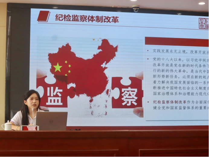 硕士研究生张金茶进行了题为《党的十八大以来我国反腐倡廉治理的新发展》的主题宣讲。她以“如何跳出治乱兴衰的历史周期率”的第二个答案作为切入点,深入探讨了党的十八大以来我国纪检监察体制改革所取得的显著进展,并紧密结合新修订的《中国共产党纪律处分条例》,将宣讲内容分为三部分:第一部分梳理了十八大以来党和国家监督体系的发展;第二部分,通过对建国以来纪委发展的历史脉络进一步阐明纪检监察体系改革的“变”与“常”;第三部分聚焦党的十八大之后纪检监察改革的新发展,特别是针对群众身边的腐败问题、政治与经济问题交织的腐败案件,强调了整治力度与成效,促使广大党员领导干部做到明规矩、知敬畏、守底线,从而巩固了党治国理政的政治基础。