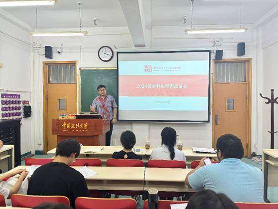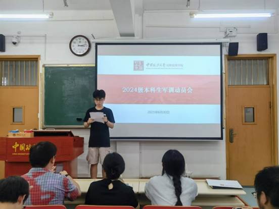 在昌平校区端升楼303室召开本科生军训动员会暨暑期安全工作部署会。学院党总支书记何欣、本科生班主任杨恩泰、辅导员徐宝国、杨璐一及全体本科生参会,会议由徐宝国主持。