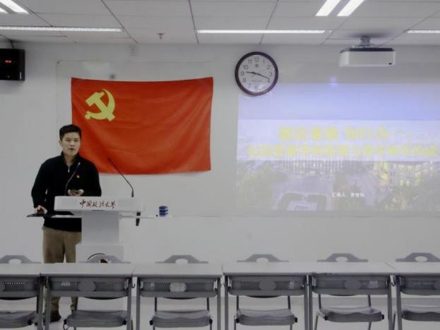 清风宣讲团副团长、博士研究生李智伟为全体党员作《德法兼修·知行合一:纪检监察学的发展与青年铁军的成长》专题分享。他结合自身经历,讲述理论学习与实习实践的联系,希望新生党员能够积极进取,砥砺前行,追寻热爱。